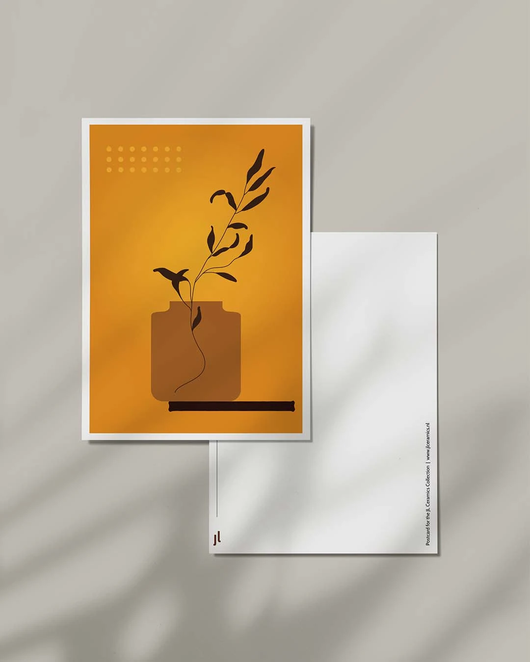 Ansichtkaart 02 is gemaakt voor die kleine briefjes die je echt wilt bewaren. Het kunstwerk begint als een handgemaakte tekening en wordt vervolgens omgezet in een strak digitaal postkaartontwerp in A6-formaat dat perfect past bij de huisstijl van JL Ceramics. Het is geïnspireerd door de natuur, een beetje grafisch en gemaakt om mooi naast je favoriete kopje of kom te staan.