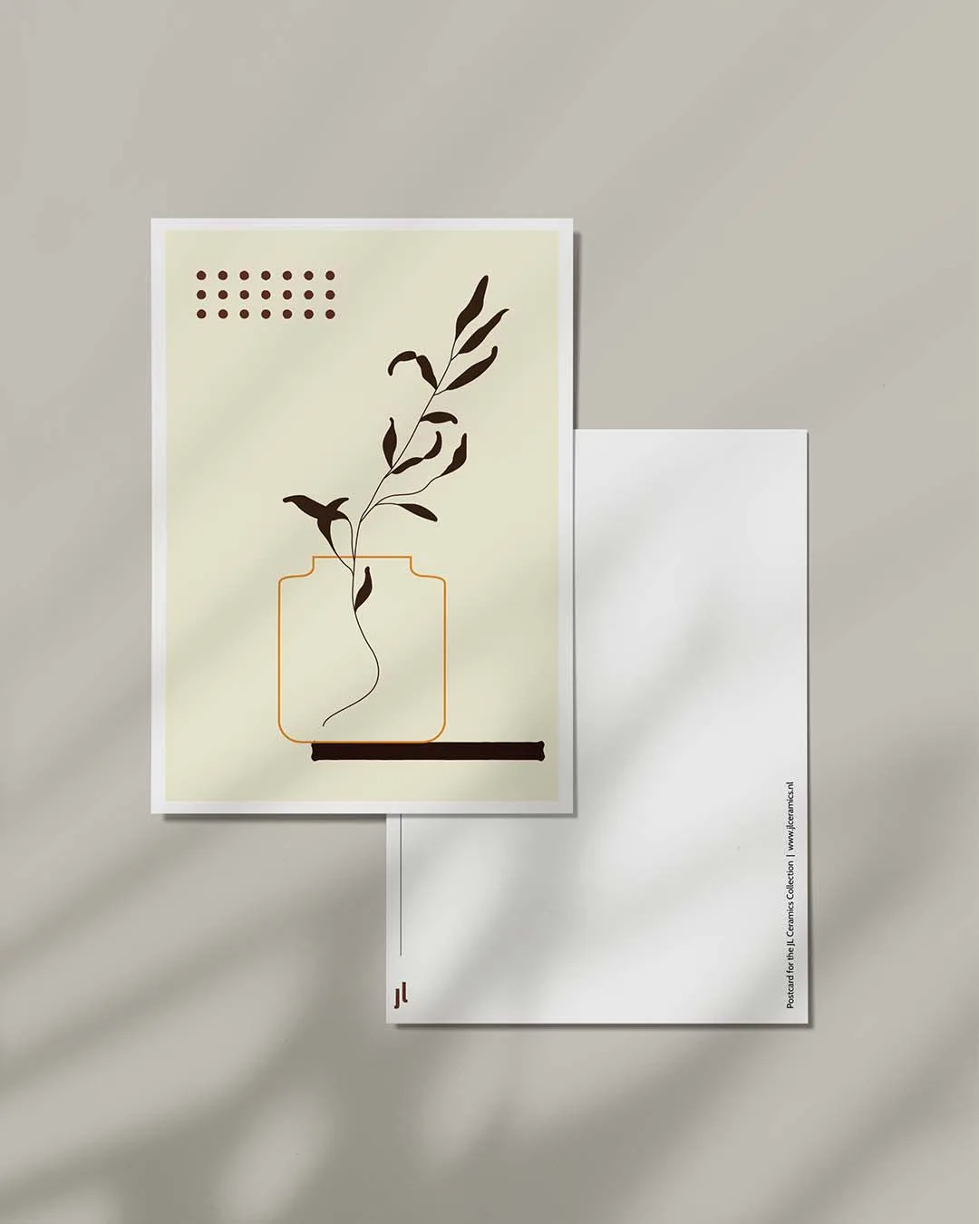 Ansichtkaart 03 is gemaakt voor die kleine briefjes die je echt wilt bewaren. Het kunstwerk begint als een handgemaakte tekening en wordt vervolgens omgezet in een strak digitaal postkaartontwerp in A6-formaat dat perfect past bij de huisstijl van JL Ceramics. Het is geïnspireerd door de natuur, een beetje grafisch en gemaakt om mooi naast je favoriete kopje of kom te staan.